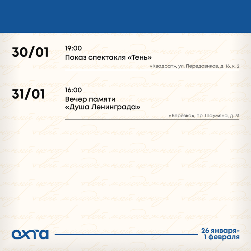31 января, 16:00 — Вечер памяти «Душа Ленинграда», молодежный центр «Берёзка», Шаумяна, 31