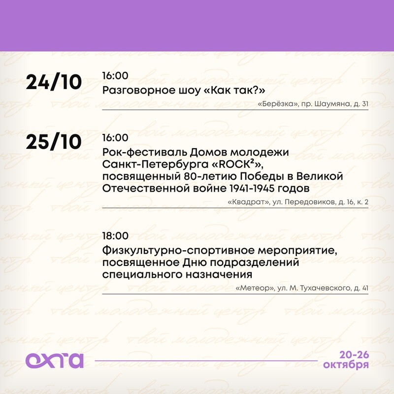 25.10, 16:00 - Рок-фестиваль Домов молодежи Санкт-Петербурга «ROCK3», посвященный 80-летию Победы в Великой Отечественной войне 1941-1945 годов