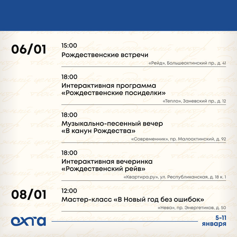 6.01, 18:00 — Музыкально-песенный вечер «В канун Рождества», молодежный клуб «Современник», Малоохтинский, 92