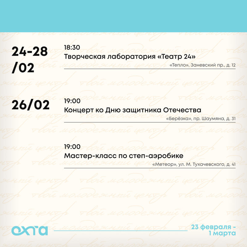 24 — 28.02, 18:30 — Творческая лаборатория «Театр 24», молодежный центр «Тепло», Заневский, 12