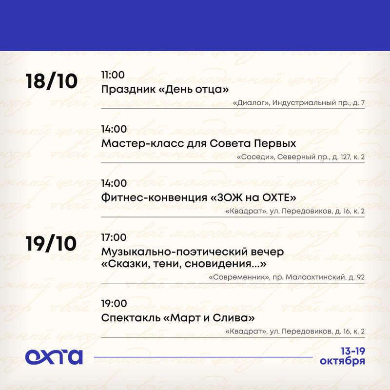 18.10, 14:00 – Фитнес-конвенция «ЗОЖ на ОХТЕ», ул. Передовиков, 16к2