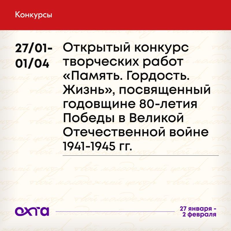 Открытый конкурс творческих работ «Память. Гордость. Жизнь», посвященный годовщине 80-летия Победы в Великой Отечественной войне 1941−1945 гг.